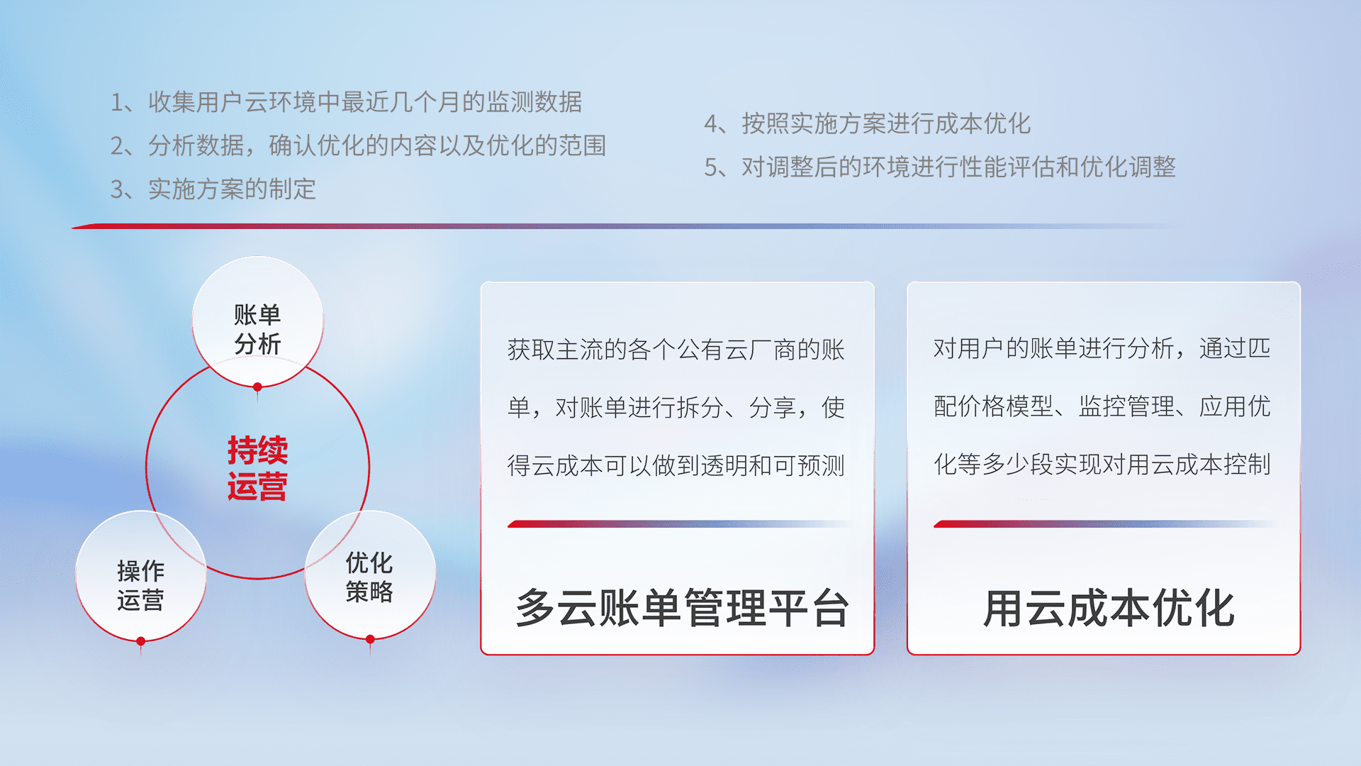 通过多云纳管,,,以统一的资源数据模型把客户的云资源进行抽象和封装,,,,进而实现对多云资源的统一操作,,,保障云资源管理的可靠性、、、稳定性与可用性。。量身定制化运维内容,,,,配置、、开发运维、、补丁管理、、备份、、、、监控、、、认证和访问管理、、、审计和日常巡检等,,保障在用云过程中的可靠度,,,,稳定度以及高可用率。。。。