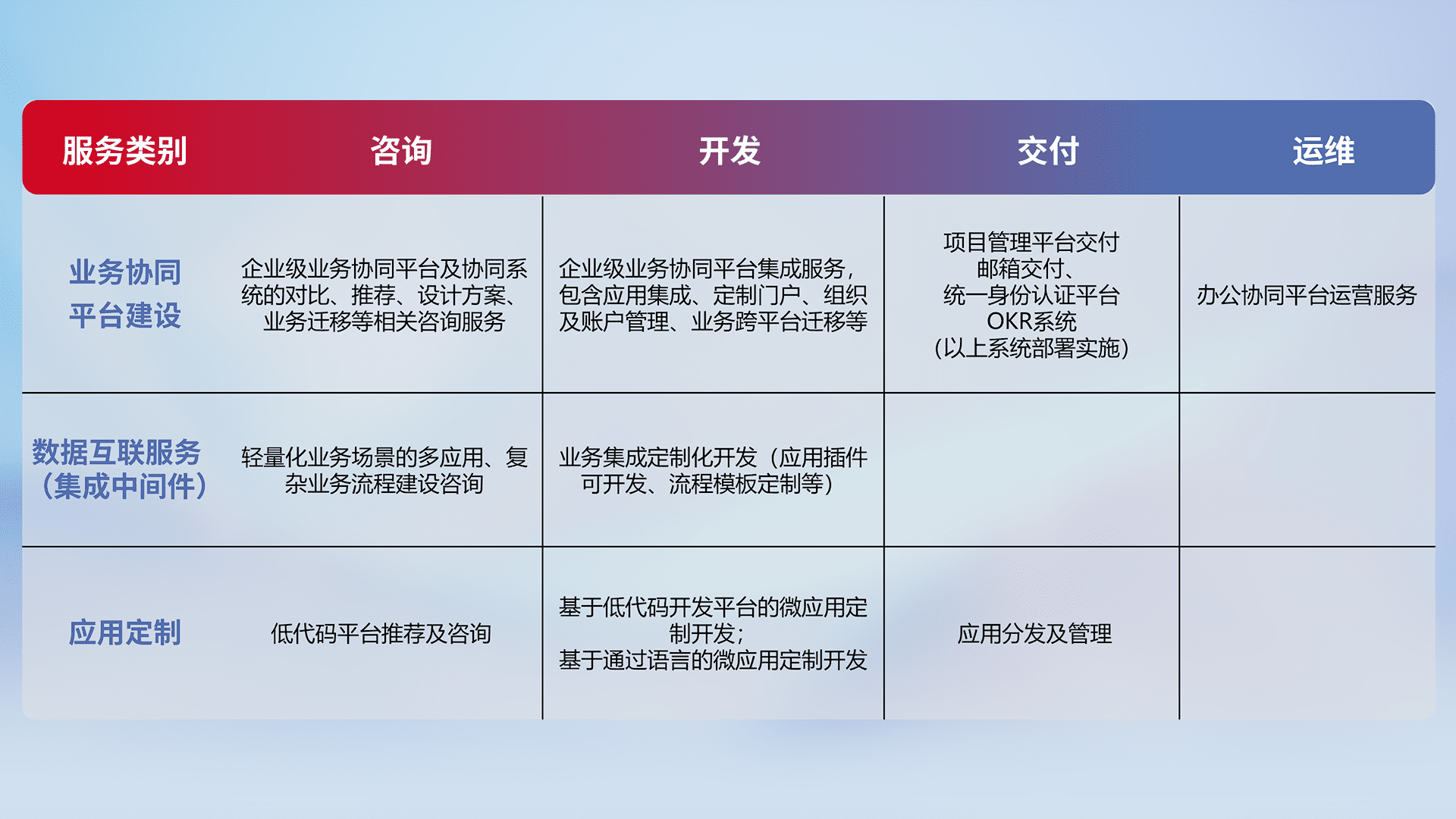针对钉钉、、、企微、、、IDaas等平台级产品提供产品的规划、、方案、、、交付、、定制化开发等服务,,,,实现如统一协同办公、、智能客户服务、、、混合会议管理、、、智能数据查询、、、等业务场景,,,实现数字化转型。。。
